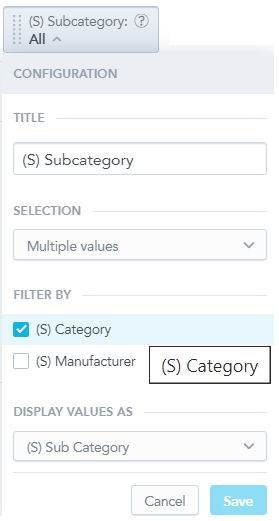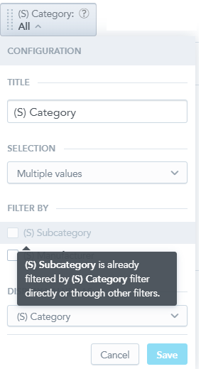 • You cannot connect a parent filter back to the child. This applies also to connections through other filters as well. For example, if you filter Subcategory by Category, you cannot configure Category to be filtered by Subcategory.